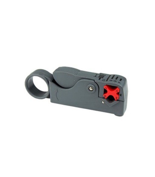 Herramienta pelacable para cables coaxil. Esta herramienta presenta dos cuchillas independientemente regulables. permitiendo el desvainado tanto del núcleo como de la malla del conductor en un solo paso. dejando preparado al conductor para la colocación del conector correspondiente.