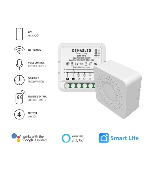 El Mini Smart Switch WiFi+RF de 4 Canales de DEMASLED es la opción ideal para transformar tu casa en un hogar inteligente. Convierte tu iluminación tradicional en iluminación conectada y controlala desde la app TUYA Smart / Smart Life, o mediante asistentes de voz como Amazon Alexa y Google Home.